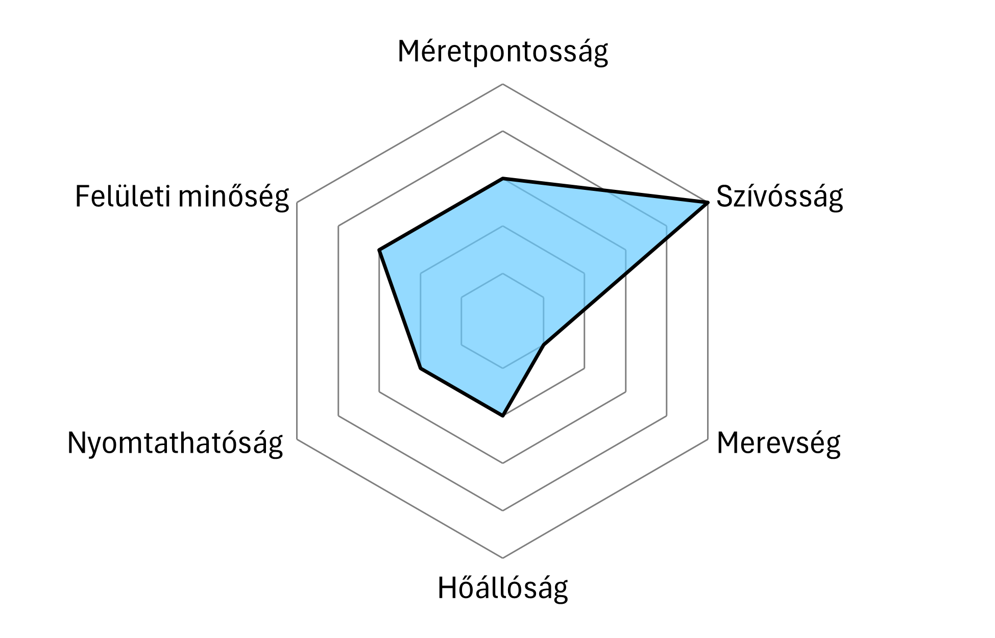 - Nem olyan hőálló, mint a műszaki filamentek (pl. ABS, PA)